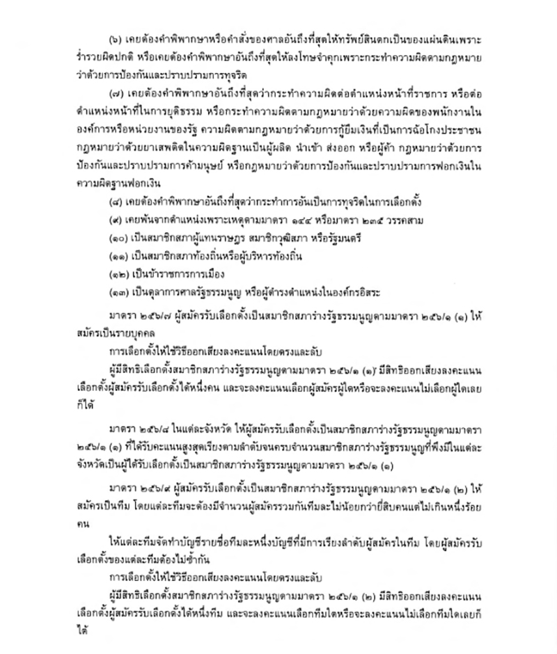 - กำหนดลักษณะต้องห้ามของผู้มีสิทธิสมัครรับเลือกตั้งเป็นสมาชิกสมาชิกสภาร่างรัฐธรรมนูญ (มาตรา 256/6)
