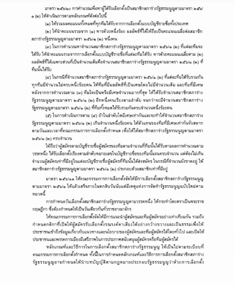 - กำหนดวิธีการคำนวณเพื่อหาผู้ใด้รับเลือกตั้งเป็นสมาชิกสภาร่างรัฐธรรมนูญแบบบัญชีรายชื่อ (มาตรา 256/10)