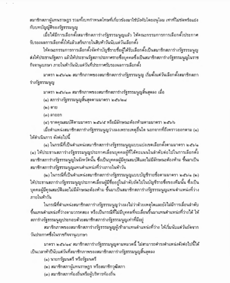 - กำหนดเหตุของการสิ้นสุดสมาชิกภาพของสมาชิกสภาสภาร่างรัฐธรรมนูญและการดำเนินการกรณีตำแหน่งสมาชิกสภาร่างรัฐธรรมนูญว่างลง (มาตรา 256/13)