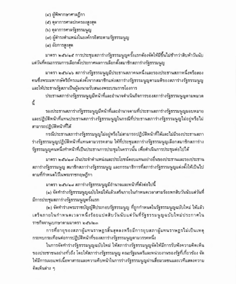 - กำหนดให้มีตำแหน่งประธานสภาร่างรัฐธรรมนูญและรองประธานสภาคนหนึ่งหรือสองคนซึ่งพระมหากษัตริย์ทรงแต่งตั้งจากสมาชิกสภาร่างรัฐธรรมนูญ และกำหนดหน้าที่และการปฏิบัติหน้าที่ของประธานและรองประธานสภาร่างรัฐธรรมนูญ (มาตรา 256/16)