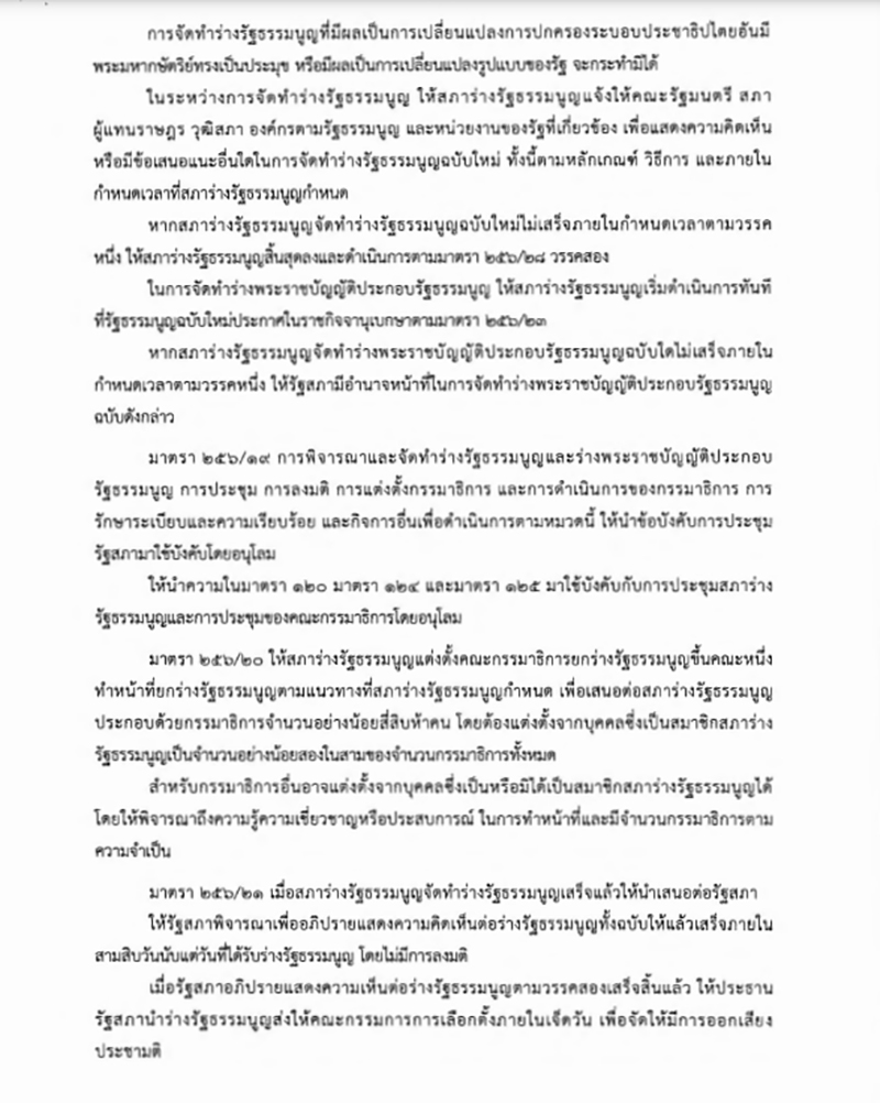 - กำหนดให้สภาร่างรัฐธรรมญจัดทำร่างรัฐธธรรมนูญให้แล้วเสร็จภายในกำหนดเวลาสามร้อยหกสิบวัน นับแต่วันที่มีการประชุมสภาร่างรัฐธรรมนูญครั้งแรก และจัดทำร่างพระราชบัญญัติประกอบรัฐธรรมนูญที่ถูกกำหนดในรัฐธรรมนูญฉบับใหม่ให้แล้วเสร็จภายในกำหนดเวลาหนึ่งร้อยแปดสิบวันนับแต่วันที่รัฐธรรมนูญญฉบับใหม่ประกาศในราชกิจจานุเบกษา โดยกำหนดให้การครบวาระของสภาผู้แทนราษฎรหรือการยุบสภาไม่กระทบการทำหน้าที่ของสภาร่างรัฐธรรมนูญ และกำหนดให้การรับฟังความคิดเห็นของประชาชนต้องทำอย่างทั่วถึง (มาตรา 256/18)