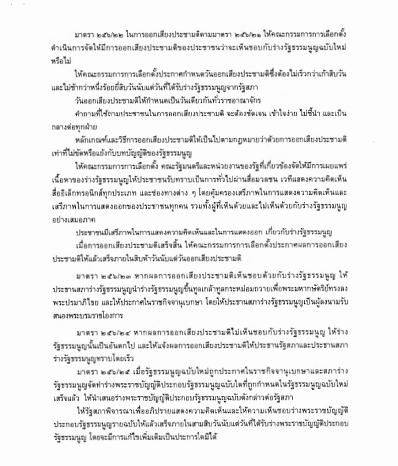 - กำหนดว่าหากคะแนนการออกเสียงประชามติเห็นชอบด้วยกับร่างรัฐธรรมนูญ ให้ประธานสภาร่างรัฐธรรมนูญนำร่างรัฐธรรมนูญขึ้นทูลเกล้าทูลกระหม่อมถวายเพื่อพระมหากษัตริย์ทรงลงพระปรมาภิไธย และไห้ประกาศในราชกิจจานเบกษา (มาตรา 256/23)