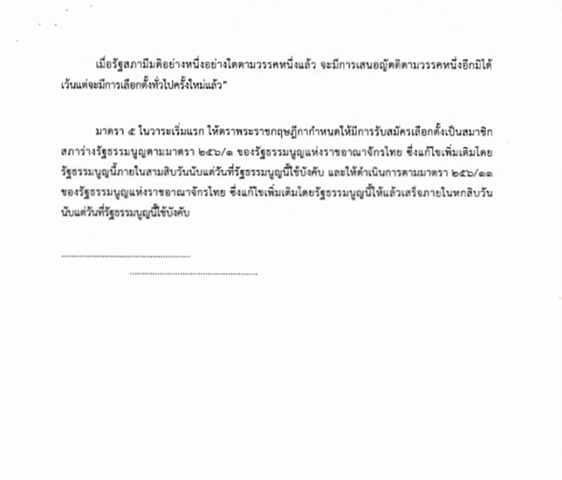 5.กำหนดให้มีการรับสมัครรับเลือกตั้งสมาชิกสภาร่างรัฐธรรมนูญภายในสามสิบวันนับแต่วันที่รัฐธรรมนูนี้ใช้บังคับ และกำหนดให้มีการเลือกตั้งสมาชิกสภาร่างรัฐธรรมนูญภายในหกสิบวัน นับแต่วันที่รัฐธรรมนูญนี้ใช้บังคับ (ร่างมาตรา 5)