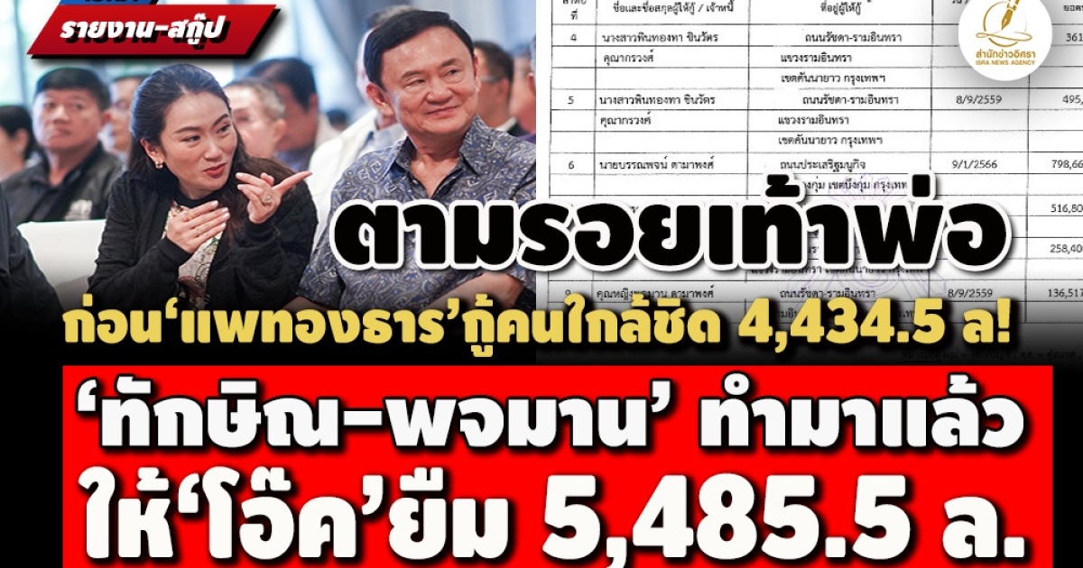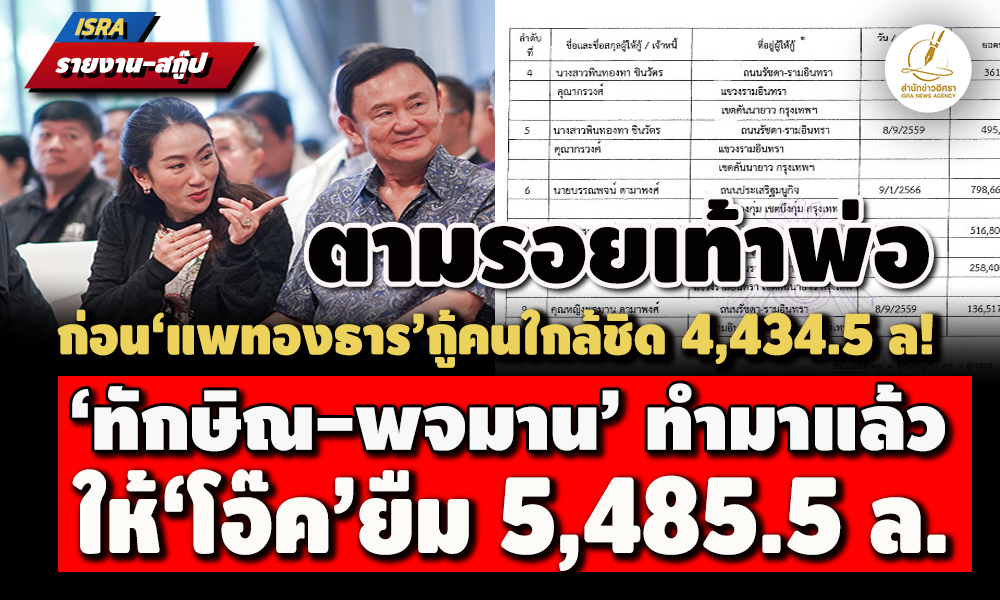 ลูกไม้ใต้ต้น! ก่อน‘แพทองธาร ชินวัตร’ ยื่นบัญชีฯมีหนี้สินตามตั๋วสัญญาใช้เงินเพื่อชำระค่าหุ้นบริษัทคนในครอบครัว 4,434.5 ล. ขุดข้อมูล ‘ทักษิณ-คุณหญิงพจมาน’ เคยทำมาแล้วปี 2540-2548 ยื่น ป.ป.ช. มีเงินให้กู้ยืม ‘โอ๊ค-พานทองแท้’หลายช่วง 427.3 - 5,485.5 ล. ‘ยิ่งลักษณ์’ ด้วย 20 ล. เสมือนตามรอยเท้าพ่อ