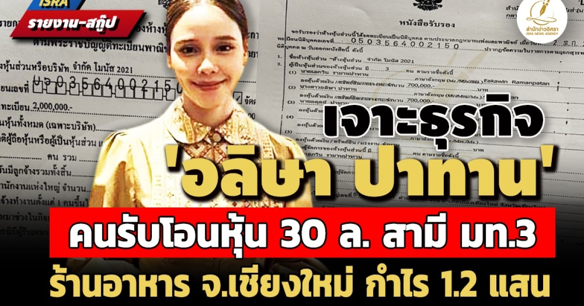 เจาะข้อมูลลึกธุรกิจ ‘อลิษา ปาทาน’ ผู้รับโอนหุ้นรับเหมา 30 ล้าน ‘อนันต์ ปาทาน’ สามี ‘ซาบีดา ไทยเศรษฐ์’ รมช.มหาดไทย ลงหุ้น 7 แสนร้านอาหารใน จ.เชียงใหม่ ปี 2564 ทุน 2 ล. งบการเงินปีล่าสุด กำไร 1.2 แสนบาท