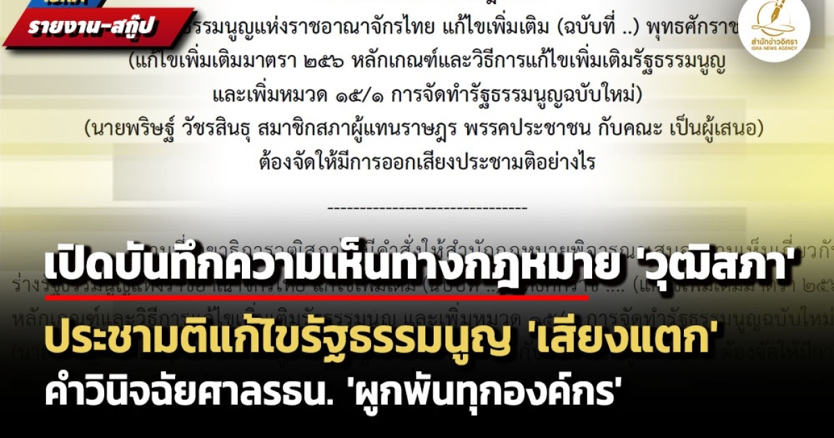 สำนักข่าวอิศรา (www.isranews.org) ขอนำ ‘บันทึกความเห็นทางกฎหมาย เรื่อง ร่างรัฐธรรมนูญแห่งราชอาณาจักรไทย แก้ไขเพิ่มเติม (ฉบับที่ ..) พุทธศักราช .... (แก้ไขเพิ่มเติมมาตรา 256 หลักเกณฑ์และวิธีการแก้ไขเพิ่มเติมรัฐธรรมนูญ และเพิ่มหมวด 15/1 การจัดทำรัฐธรรมนูญฉบับใหม่) (นายพริษฐ์ วัชรสินธุ สมาชิกสภาผู้แทนราษฎร พรรคประชาชน กับคณะ เป็นผู้เสนอ) ต้องจัดให้มีการออกเสียงประชามติอย่างไร