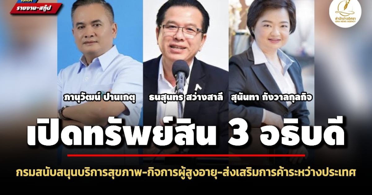 ป.ป.ช. เปิดทรัพย์สิน 3 อธิบดี 'ภานุวัฒน์ ปานเกตุ' กรมสนับสนุนบริการสุขภาพ ทรัพย์สิน 14.4 ล.-'ธนสุนทร สว่างสาลี' กรมกิจการผู้สูงอายุ ทรัพย์สิน 12.2 ล.-'สุนันทา กังวาลกุลกิจ' กรมส่งเสริมการค้าระหว่างประเทศ ทรัพย์สิน 8.3 ล.