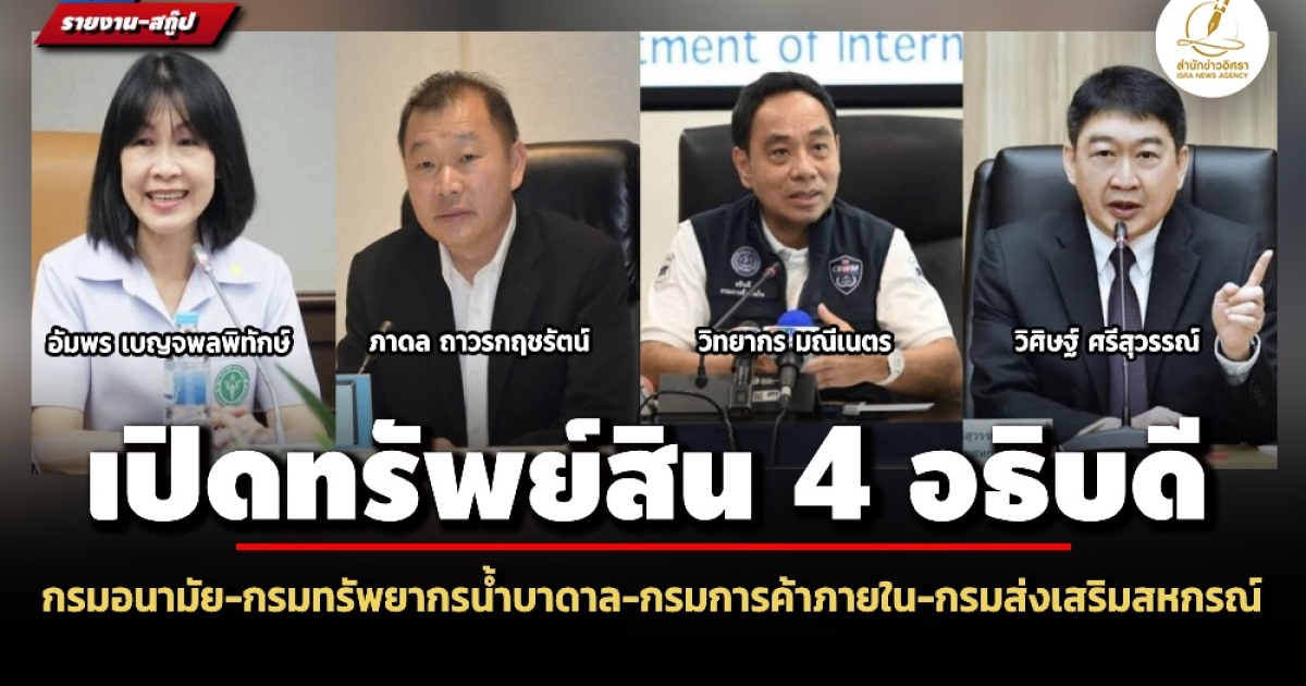 ป.ป.ช. เปิดทรัพย์สิน 4 อธิบดี 'อัมพร เบญจพลพิทักษ์' กรมอนามัย มากสุด 166 ล.-'ภาดล ถาวรกฤชรัตน์' กรมทรัพยากรน้ำบาดาล 67 ล.-'วิทยากร มณีเนตร' กรมการค้าภายใน 45 ล.-'วิศิษฐ์ ศรีสุวรรณ์' กรมส่งเสริมสหกรณ์ 16 ล.