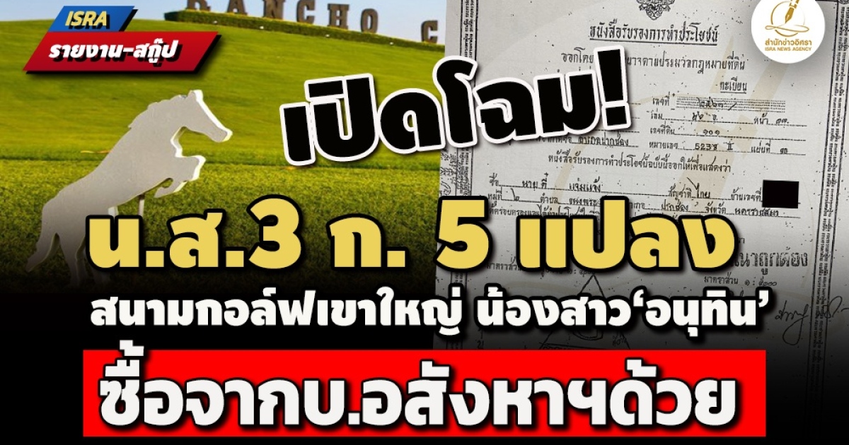 ISRA INVESTIGATIVE! คราวนี้เผยโฉม น.ส.3 ก. 5 แปลง 116 ไร่ สนามกอล์ฟ แรนโช เขาใหญ่ น้องสาว ‘อนุทิน ชาญวีรกูล’ เปลี่ยนมือหลายทอด พบ 4 ใน 5 แปลง สลักหลังห้ามโอนภายใน 5 ปี - 2 แปลง กก.หุ้นใหญ่ซื้อจากบริษัทอสังหาฯ ก่อนโอนชำระค่าหุ้น รมว.มหาดไทยแจงในสภาฯเจ้าของได้มาสุจริต