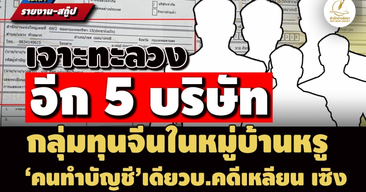 เจาะทะลวงลอตใหม่! อีก 5 บริษัทกลุ่มทุนจีนในหมู่บ้านหรูกลางเมืองหลวง คนไทยจดทะเบียนก่อตั้งก่อนโอนหุ้น บางรายอายุแค่ 20 ปี พบกระบวนการจัดตั้ง ตัวละคร เบอร์โทร. อี-เมล เชื่อมโยงกัน งบการเงิน‘ไม่มีรายได้’ ใช้‘คนทำบัญชี’รายเดียวนิติบุคคลคดีเหลียน เซิง