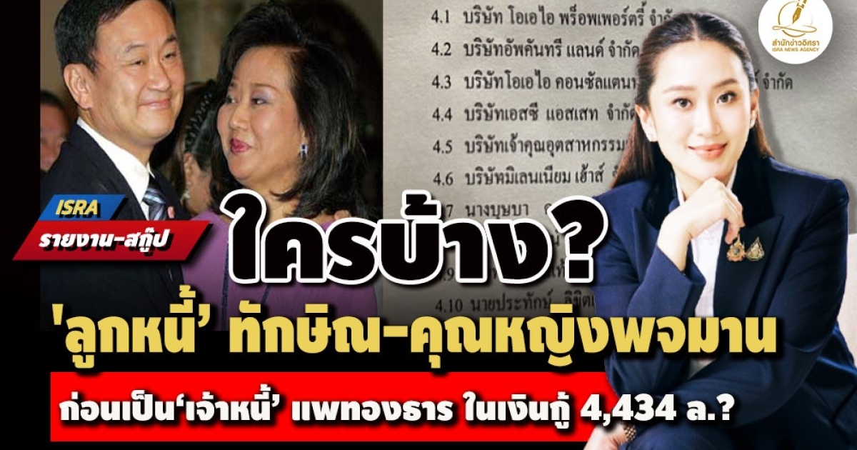 ขุดชัด ๆ ‘ทักษิณ-คุณหญิงพจมาน’ ให้กู้ยืม‘บรรณพจน์ -บุษบา ดามาพงศ์ - พานทองแท้’ พร้อม 6 บริษัทในครอบครัวใกล้ชิด 12 ราย 7,137 ล. ช่วงปี 2544 - 2548 ใครบ้าง? ก่อนเป็น‘เจ้าหนี้’ 1,909 ล. นายกฯ ‘แพทองธาร ชินวัตร’ ในตั๋วสัญญาใช้เงินปริศนา 4,434 ล.