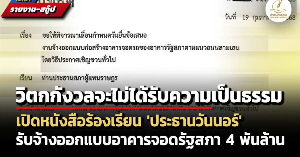 สืบเนื่องจากตอนที่แล้ว สำนักข่าวอิศรา (www.isranews.org) ได้เปิดหนังสือร้องเรียนบริษัทที่ประสงค์รับจ้างออกแบบอาคารจอดรถของอาคารรัฐสภาตามแนวถนนสามเสน มูลค่า 4,593 ล้านบาท ไปถึง ‘ว่าที่ร้อยตรี อาพัทธ์ สุขะนันท์’ จำนวน 2 ฉบับ เพื่อขอให้พิจารณาเลื่อนกำหนดวันยื่นข้อเสนอ เนื่องจากเห็นว่า ระยะเวลา 10 วัน ไม่เพียงพอต่อการจัดทำข้อเสนอและควรให้เวลาไม่น้อยกว่า 90 วัน จำนวน 2 ฉบับเป็นตอนแรก แต่ไม่ได้รับคำตอบจากเลขาธิการสภาผู้แทนราษฎร