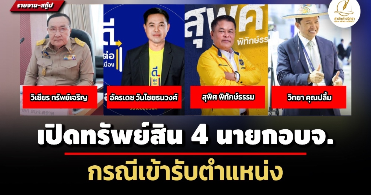สำนักข่าวอิศรา (www.isranews.org) รายงานว่า เมื่อเร็ว ๆ นี้ สำนักงานคณะกรรมการการป้องกันและปราบการทุจริตแห่งชาติ (ป.ป.ช.) เปิดเผยบัญชีแสดงรายการทรัพย์สินและหนี้สินนายกองค์การบริหารส่วนจังหวัด (อบจ.) กรณีเข้ารับตำแหน่ง 4 ราย ได้แก่