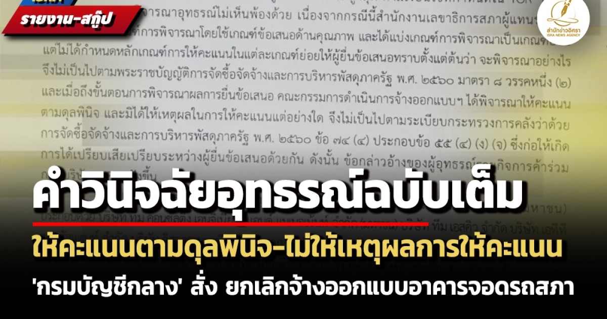 - มติ ‘กรมบัญชีกลาง’ อุทธรณ์ฟังขึ้น ปม ค้าน บ.ผู้ชนะเสนอราคาจ้างออกแบบอาคารจอดรถรัฐสภา