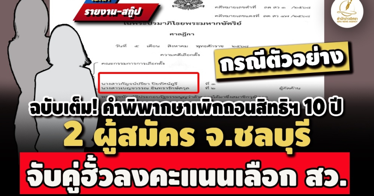มาแล้วกรณีตัวอย่าง! เปิดคำพิพากษาฉบับเต็มคดี ‘กัญจน์ปรียา ปิยทัศน์ภูรี -เบญจวรรณ อินทรารักษ์สกุล’ 2 ผู้มีสิทธิเลือกระดับจังหวัด ชลบุรี ฮั้วลงคะแนนเลือก สว. สั่งเพิกถอนสิทธิสมัคร 10 ปี ละเอียดยิบ ส่งข้อความสนทนาในไลน์ ‘จู –หมอJeab^-^Bj’ “เราเป็นเนื้อคู่ กันแน่เลยค่ะ มาจับคู่เลือกกันนะคะอาทิตย์นี้” - “ยินดี ค่ะ จับมือกันแน่นะคะ” อ้างยกเลิกหลังทราบในกลุ่มว่ากระทำผิด พยานหลักฐานมัดฟังไม่ขึ้น ชี้ไม่สุจริตเที่ยงธรรม