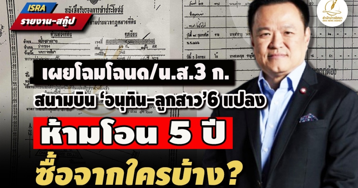 ดูชัด ๆ ลอตแรก โฉนด – น.ส.3 ก. สนามบินปากช่อง 6 ใน 17 แปลง ก่อนถึงมือ ‘อนุทิน ชาญวีรกูล’พร้อม‘นัยน์ภัค’ บุตรสาว สลักหลังห้ามโอนใน 5 ปี ออกตามนโยบายแปลงสินทรัพย์เป็นทุน มีชื่อ‘สนองนุช’อดีตภรรยาซื้อด้วยแล้วยกให้ลูก ก่อนตีเป็นหุ้นตั้ง บ.เจริญคีรี