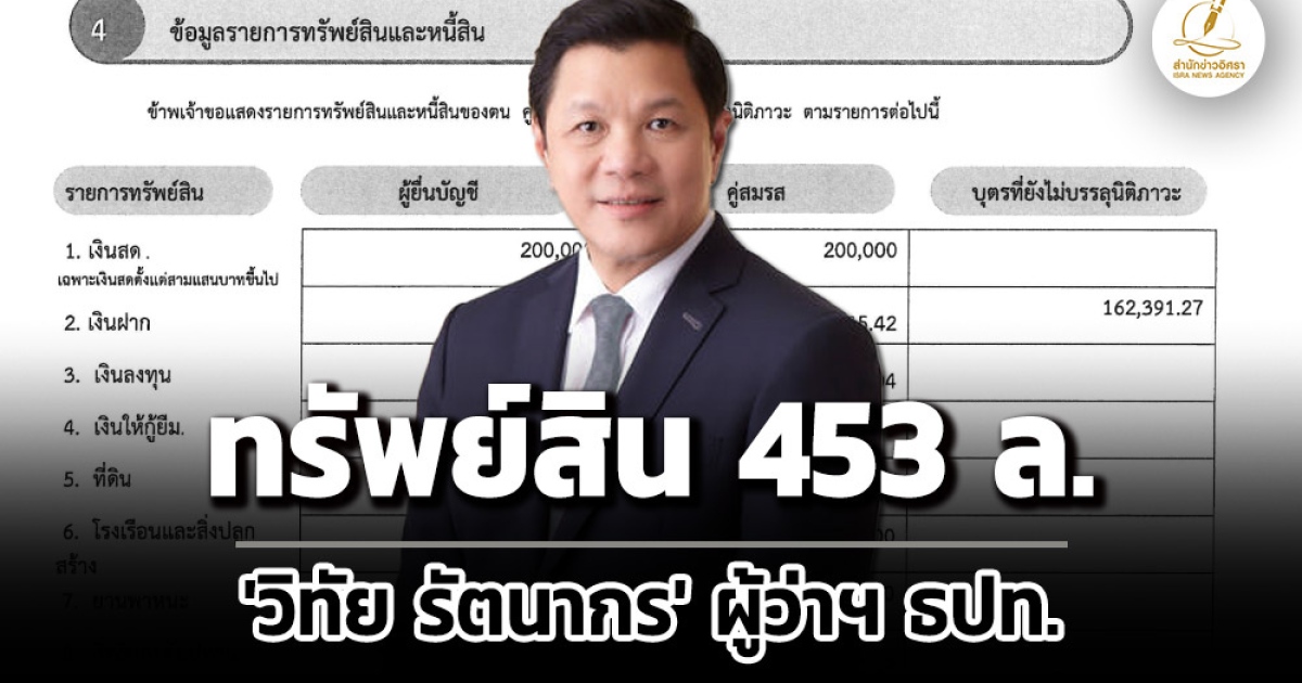 นายวิทัย พร้อมด้วย นางวิจิตรา รัตนากร คู่สมรส และบุตรที่ยังไม่บรรลุนิติภาวะ แจ้งมีทรัพย์สินทั้งสิ้น 453,539,986 บาท หนี้สินทั้งสิ้น 110,285 บาท