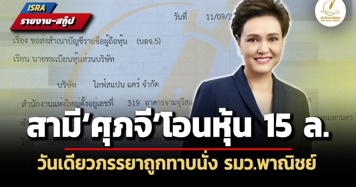 เปิดข้อมูล สามี‘ศุภจี สุธรรมพันธุ์’โอนหุ้น 15 ล้าน /48% ให้คนในบริษัท นำส่งรายชื่อ บอจ.5 กรมพัฒนาฯ 11 ก.ย.2568 ระบุวันลงทะเบียนย้อนหลัง 8 ก.ย.2568 ตรงวันข่าวสะพัดภรรยาถูกทาบนั่ง รมว.พาณิชย์ ครม.อนุทิน ก่อนแถลงเปิดตัวพรรคภูมิใจไทย 10 ก.ย.68 ขณะที่บช.ทรัพย์สินไม่ระบุมีรายได้ซื้อขายหุ้น