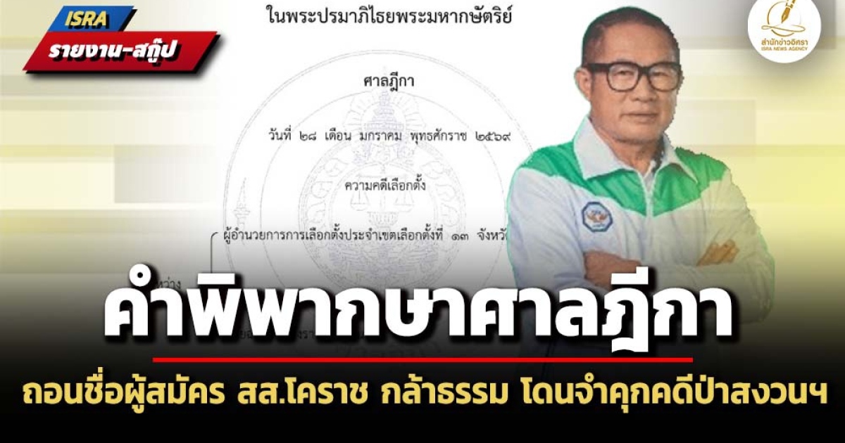 สำนักข่าวอิศรา www.isranews.org : เมื่อวันที่ 28 มกราคม 2569 ศาลฎีกามีคำสั่งให้ถอนชื่อนายฉลอง แสงราษฎร์เมฆินทร์ ผู้คัดค้าน ออกจากประกาศรายชื่อผู้สมัครรับเลือกตั้งสมาชิกสภาผู้แทนราษฎรแบบแบ่งเขตเลือกตั้งที่ 13 จังหวัดนครราชสีมา ของพรรคกล้าธรรม กรณีได้รับโทษจําคุก 3 ปี 4 เดือน 15 วัน ในความผิดต่อพระราชบัญญัติป่าสงวนแห่งชาติ และความผิดต่อพระราชบัญญัติป่าไม้ พ้นโทษเมื่อวันที่ 6 ธันวาคม 2560 โดยได้พ้นโทษมายังไม่ถึงสิบปีนับถึงวันเลือกตั้ง จึงเป็นบุคคลผู้มีลักษณะเป็นบุคคลต้องห้ามมิให้ใช้สิทธิสมัครรับเลือกตั้งเป็นสมาชิกสภาผู้แทนราษฎร ตามรัฐธรรมนูญแห่งราชอาณาจักรไทย มาตรา 98 (7) และพระราชบัญญัติประกอบรัฐธรรมนูญว่าด้วยการเลือกตั้งสมาชิกสภาผู้แทนราษฎร พ.ศ. 2561 มาตรา 42 (9)