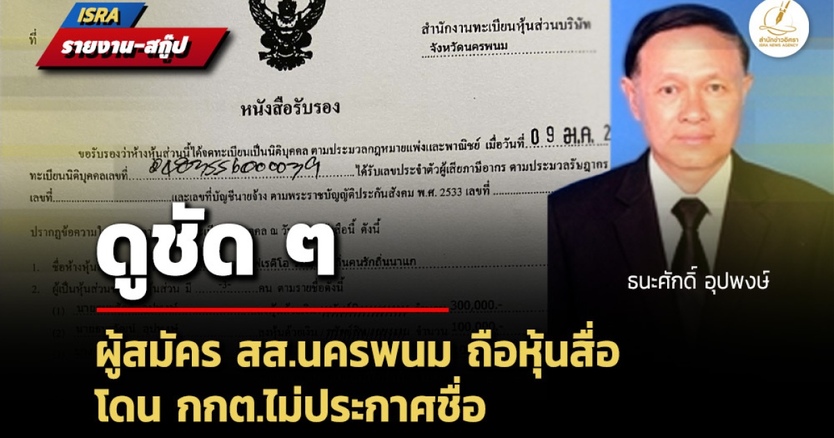 พลิกเอกสารดูชัดๆ ‘ธนะศักดิ์ อุปพงษ์’ ผู้สมัคร สส.นครพนม พรรคไทยพร้อม ถือหุ้น หจก. สมายเวฟเรดิโอฯ ลงทุนด้วยเงิน 3 แสน แจ้งวัตถุประสงค์ประกอบกิจการสื่อ สถานะยังเปิดดำเนินการ ที่มาถูก กกต.ไม่ประกาศชื่อ เจ้าตัวร้องเพิกถอนคำสั่ง ศาลฏีกาพิพากษาชอบแล้ว
