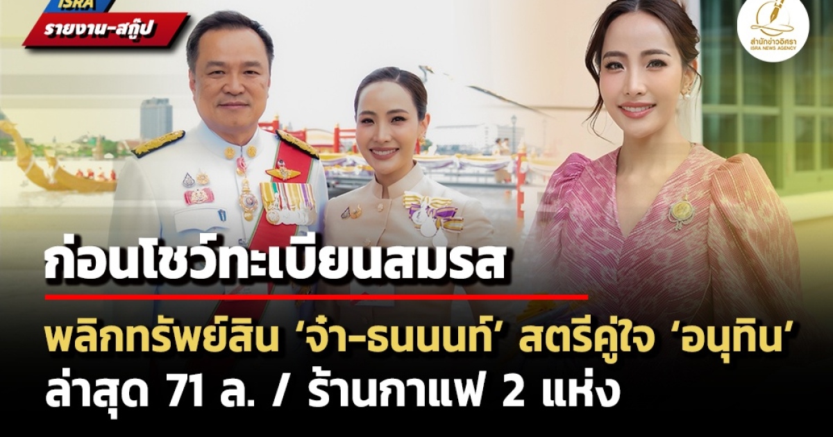 พลิกทรัพย์สิน‘ธนนนท์ นิรามิษ’ สุภาพสตรีคู่สมรสคู่ใจ ‘อนุทิน ชาญวีรกูล’ นายกฯ หน.พรรคภูมิใจไทย แจ้งปี 2566 สถานะ‘อยู่กินกันฉันสามีภริยา’ 39.4 ล. – มิ.ย. 2568 จำนวน 56 ล. เจ้าของร้านกาแฟ 2 แห่ง ล่าสุด ต.ค. 71 ล. ก่อนโชว์จดทะเบียนสมรส 13 ก.พ.2569 ชื่นมื่นวันวาเลนไทน์