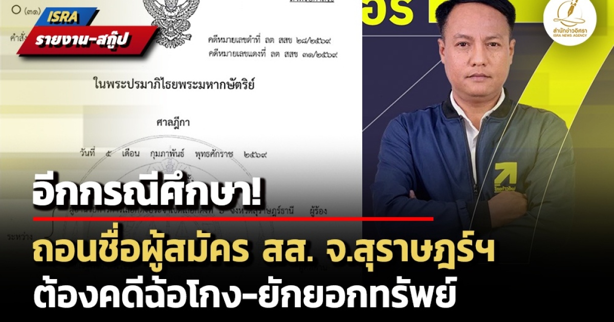สำนักข่าวอิศรา www.isranews.org : วันที่ 5 กุมภาพันธ์ 2569 ศาลฎีกามีคําสั่งให้ถอนชื่อนายณัฐพงษ์ สาโรจน์ ผู้คัดค้าน ออกจากประกาศรายชื่อผู้สมัครรับเลือกตั้งสมาชิกสภาผู้แทนราษฎรแบบแบ่งเขตเลือกตั้ง เขตเลือกตั้งที่ 6 จังหวัดสุราษฎร์ธานี พรรคไทยก้าวใหม่ เนื่องจากเคยต้องคําพิพากษาอันถึงที่สุดว่ากระทําความผิดฐานฉ้อโกง และฐานยักยอก อันเป็นการกระทําความผิดเกี่ยวกับทรัพย์โดยทุจริตตามประมวลกฎหมายอาญา เป็นบุคคลต้องห้ามมิให้ใช้สิทธิสมัครรับเลือกตั้งเป็นสมาชิกสภาผู้แทนราษฎร