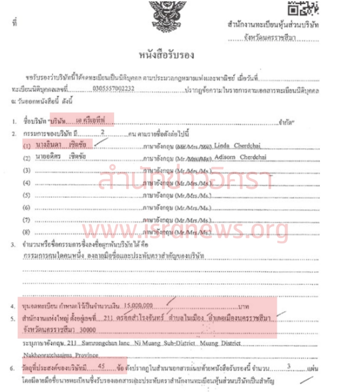 ทั้งนี้ สำนักข่าวอิศรา ได้พยายามติดต่อนางลินดา ตามเบอร์โทรศัพท์ที่แจ้งไว้ในเอกสารจดทะเบียนตั้งบริษัท เพื่อให้ชี้แจงข้อเท็จจริง แต่ยังไม่สามารถติดต่อได้