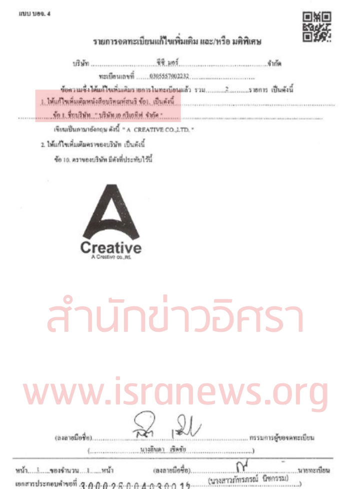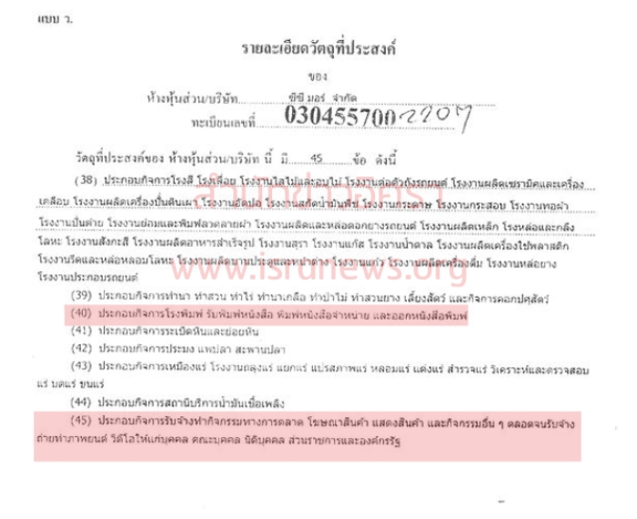 ล่าสุดพบว่าในการจดทะเบียนจัดตั้งบริษัทฯ บริคณห์สนธิแจ้งรายละเอียดวัตถุที่ประสงค์เกี่ยวข้องกับสื่อด้วย