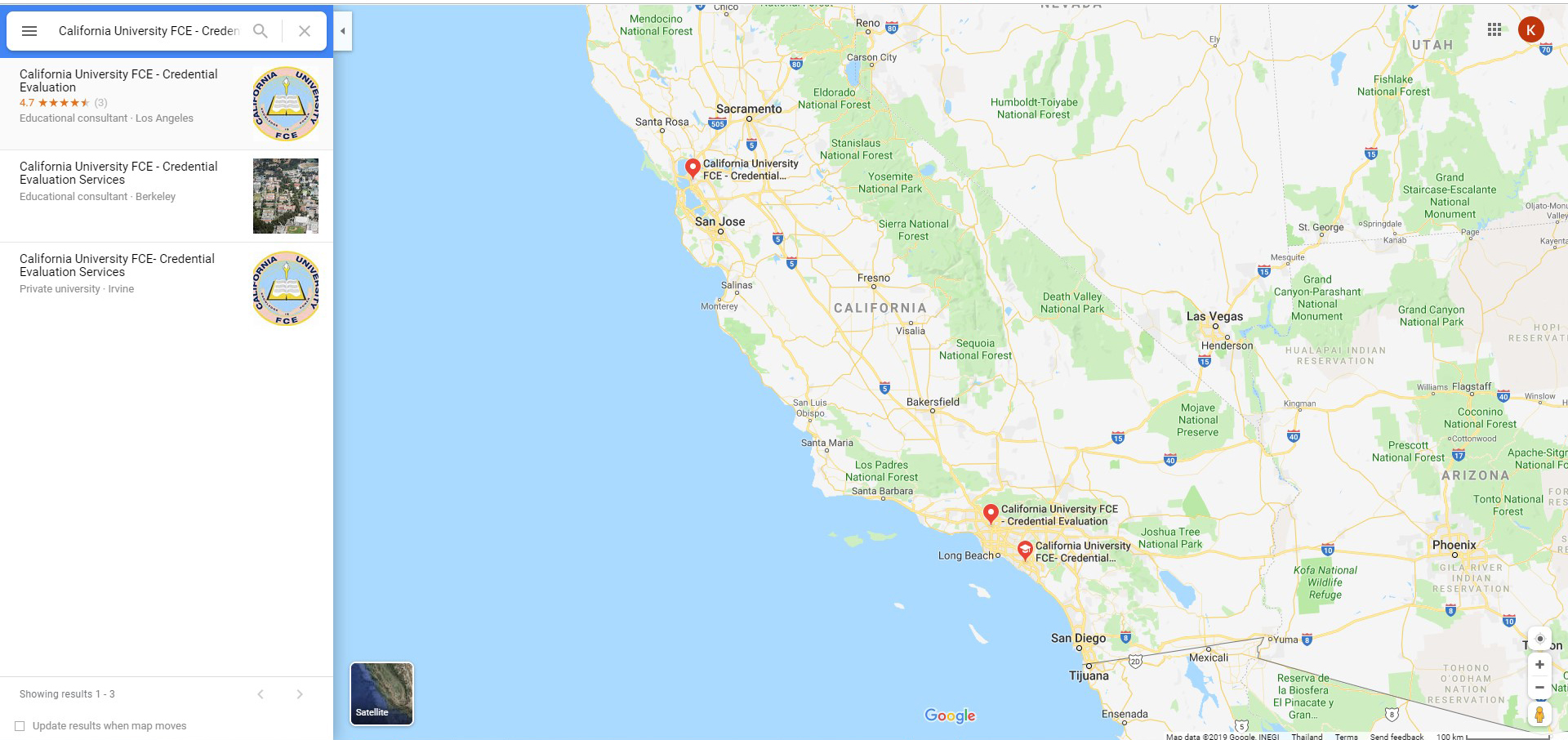 สำนักข่าวอิศรา รายงานต่อว่า เมื่อนำชื่อ CALIFORNIA UNIVERSITY Foreign Credential Evaluation ไปสืบค้นใน Google Maps พบที่ตั้งมหาวิทยาลัยนี้จำนวน 3 แห่งตั้งอยู่ในฝั่งตะวันตกของสหรัฐอเมริกา