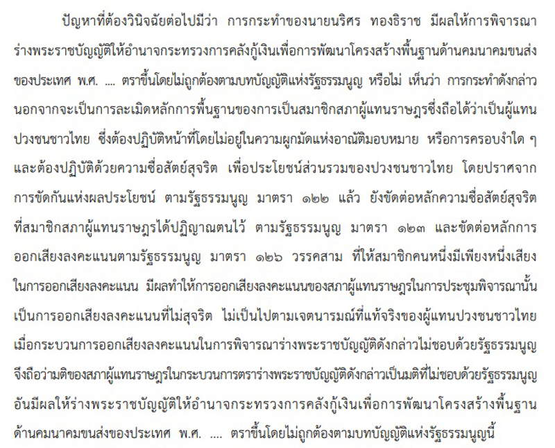 ปัญหาที่ต้องวินิจฉัยต่อไปว่า การกระทำของนายนริศร มีผลให้การพิจารณาร่าง พ.ร.บ.เงินกู้ 2 ล้านล้านบาท ตราขึ้นโดยไม่ถูกต้องตามรัฐธรรมนูญหรือไม่ ศาลรัฐธรรมนูญเห็นว่า การกระทำดังกล่าวเป็นการละเมิดหลักการพื้นฐานของการเป็น ส.ส. ซึ่งถือได้ว่าเป็นตัวแทนของปวงชนชาวไทย ต้องปฏิบัติหน้าที่โดยไม่อยู่ในความผูกมัดแห่งอาณัติมอบหมาย หรือการครอบงำใด ๆ และต้องปฏิบัติด้วยความซื่อสัตย์สุจริต เพื่อประโยชน์ส่วนรวมของปวงชนชาวไทย โดยปราศจากการขัดแห่งผลประโยชน์ตามรัฐธรรมนูญ (ปี 2550) มาตรา 122 ยังขัดต่อหลักความซื่อสัตย์สุจริตที่ ส.ส. ได้ปฏิญาณตนไว้ ตามรัฐธรรมนูญ (ปี 2550) มาตรา 123 และขัดต่อหลักการออกเสียงลงคะแนนตามรัฐธรรมนูญ (ปี 2550) มาตรา 126 วรรคสาม ที่ให้สมาชิกคนหนึ่งมีเพียงหนึ่งเสียงในการออกเสียงลงคะแนน