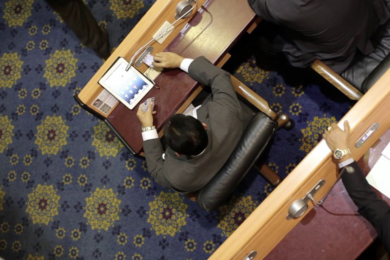 (ภาพนายนริศร ทองธิราช อดีต ส.ส.สกลนคร พรรคเพื่อไทย ในการเสียบบัตรแทนกันร่าง พ.ร.บ.เงินกู้ 2 ล้านล้านบาท, ภาพจาก Posttoday)