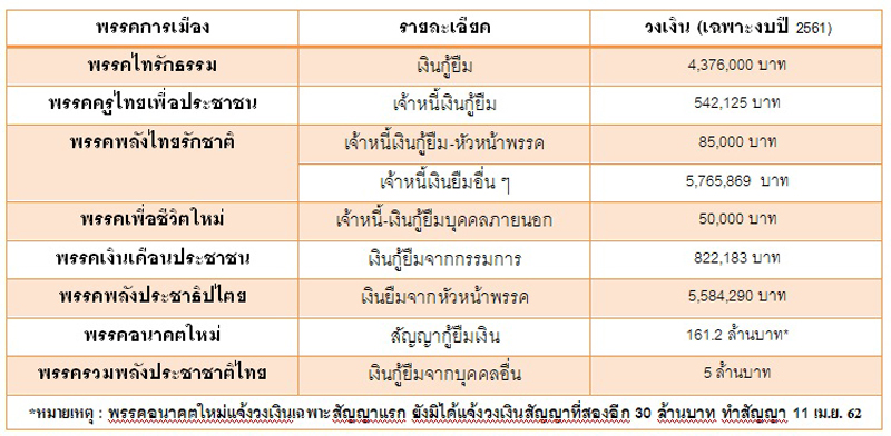 (ตารางสรุปการกู้ยืมเงินอย่างน้อย 8 พรรค จากหัวหน้า-กรรมการบริหาร-บุคคลอื่น)