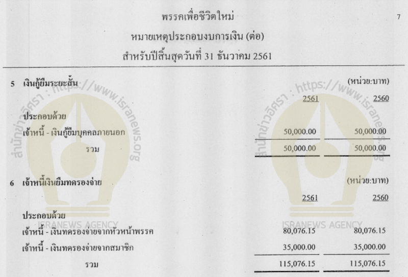 4.พรรคเพื่อชีวิตใหม่ แจ้งหนี้สินในส่วนเงินกู้ยืม แบ่งเป็น 2 ส่วน ได้แก่ 1.เจ้าหนี้-เงินกู้ยืมบุคคลภายนอก ปี 2561 วงเงิน 50,000 บาท 2.เจ้าหนี้เงินยืมทดรองจ่าย แบ่งเป็น เจ้าหนี้-เงินทดรองจ่ายหัวหน้าพรรค 80,076 บาท และเจ้าหนี้เงินทดรองจ่ายสมาชิกพรรค 35,000 บาท รวมทั้งหมดในปี 2561 จำนวน 115,076 บาท