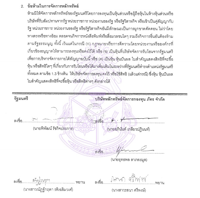 ทั้งนี้ในสัญญาระบุชัด ห้ามมิให้จัดการหลักทรัพย์ของรัฐมนตรี โดยการลงทุนเป็นหุ้นส่วน หรือผู้ถือหุ้นในห้างหุ้นส่วน หรือบริษัท ที่รับสัมปทานจากรัฐ หน่วยราชการ หน่วยงานของรัฐ หรือรัฐวิสาหกิจ หรือเข้าเป็นคู่สัญญากับรัฐ หน่วยราชการ หน่วยงานของรัฐ หรือรัฐวิสาหกิจ อันมีลักษณะเป็นการผูกขาดตัดตอน ไม่ว่าโดยตรงหรือทางอ้อม รวมถึงกิจการหนังสือพิมพ์หรือสื่อมวลชนใด ๆ รวมถึงกิจการต้องห้ามอื่น ๆ ตามรัฐธรรมนูญ