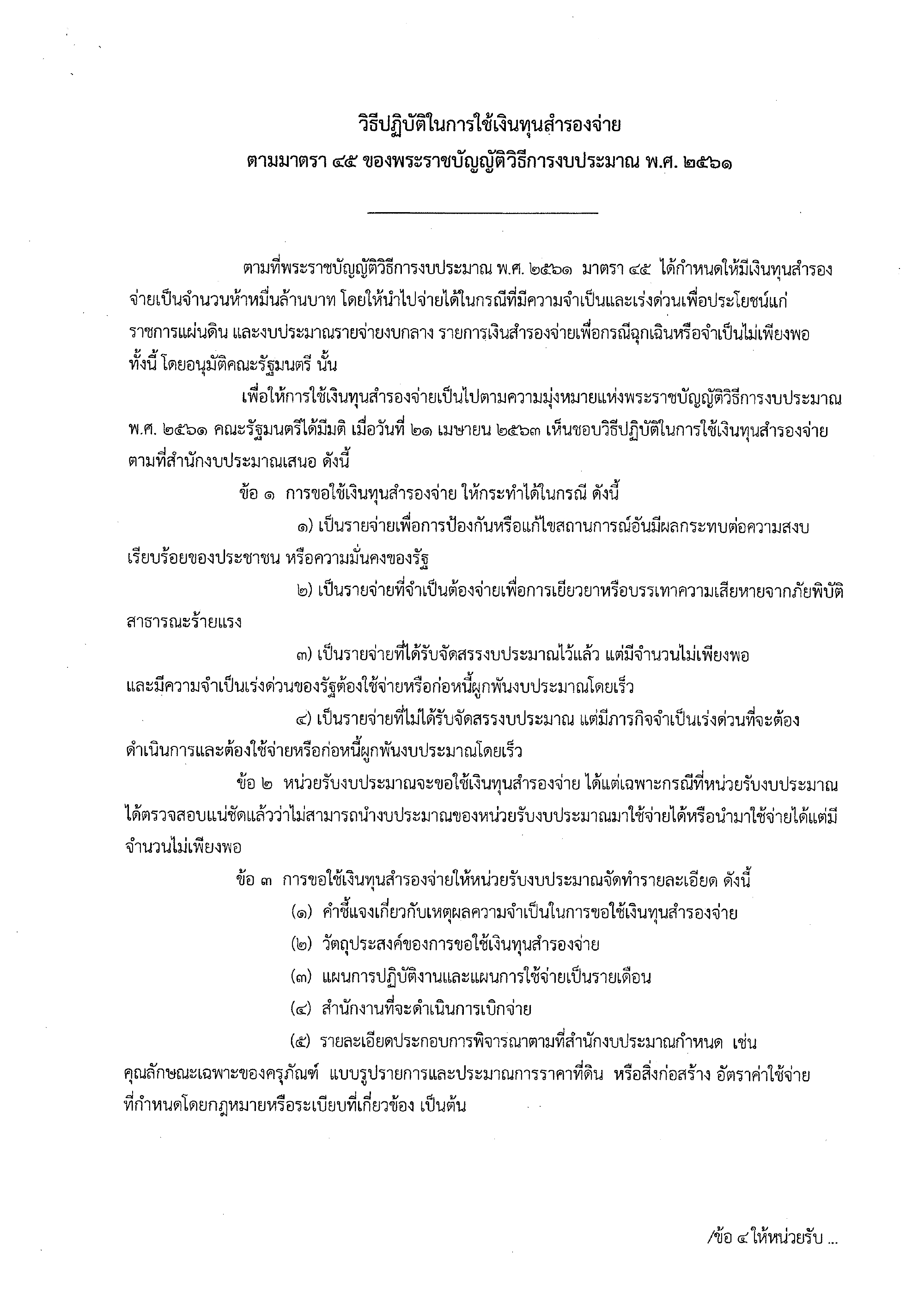 "...ประกาศฉบับนี้กำหนดให้การขอใช้ ‘เงินทุนสำรองจ่าย’ ให้กระทำได้ใน 4 กรณี คือ 1.เป็นรายจ่ายเพื่อการป้องกันหรือแก้ไขสถานการณ์อันมีผลกระทบต่อความสงบเรียบร้อยของประชาชน หรือความมั่นคงของรัฐ 2.เป็นรายจ่ายที่จำเป็นต้องจ่ายเพื่อการเยียวยาหรือบรรเทาความเสียหายจากภัยพิบัติสาธารณะร้ายแรง..."