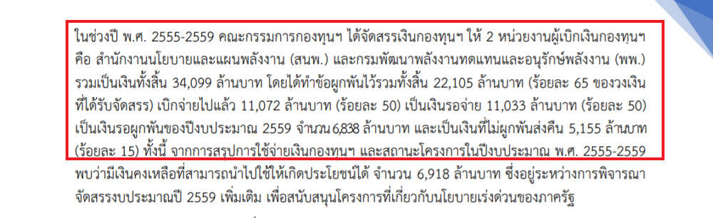 “...มีโครงการหนึ่งน่าสนใจมาก เป็นโครงการโซลาร์ฟาร์ม (ไฟฟ้าพลังงานแสงอาทิตย์) กำลังผลิตติดตั้ง 1 เมกะวัตต์ในพื้นที่จ.ขอนแก่น ซึ่งใช้เงินของกองทุนอนุรักษ์พลังงานฯเมื่อปี 57-58 ซึ่งหลังจากกระทรวงพลังงานส่งคนลงไปดู ปรากฏว่าเมื่อไปยังที่ตั้งโครงการฯพบว่าแผงบางส่วนไม่อยู่แล้ว มีการนำแผงไปแยกชิ้นขาย เพราะไม่มีใครเข้าไปดูแล...”