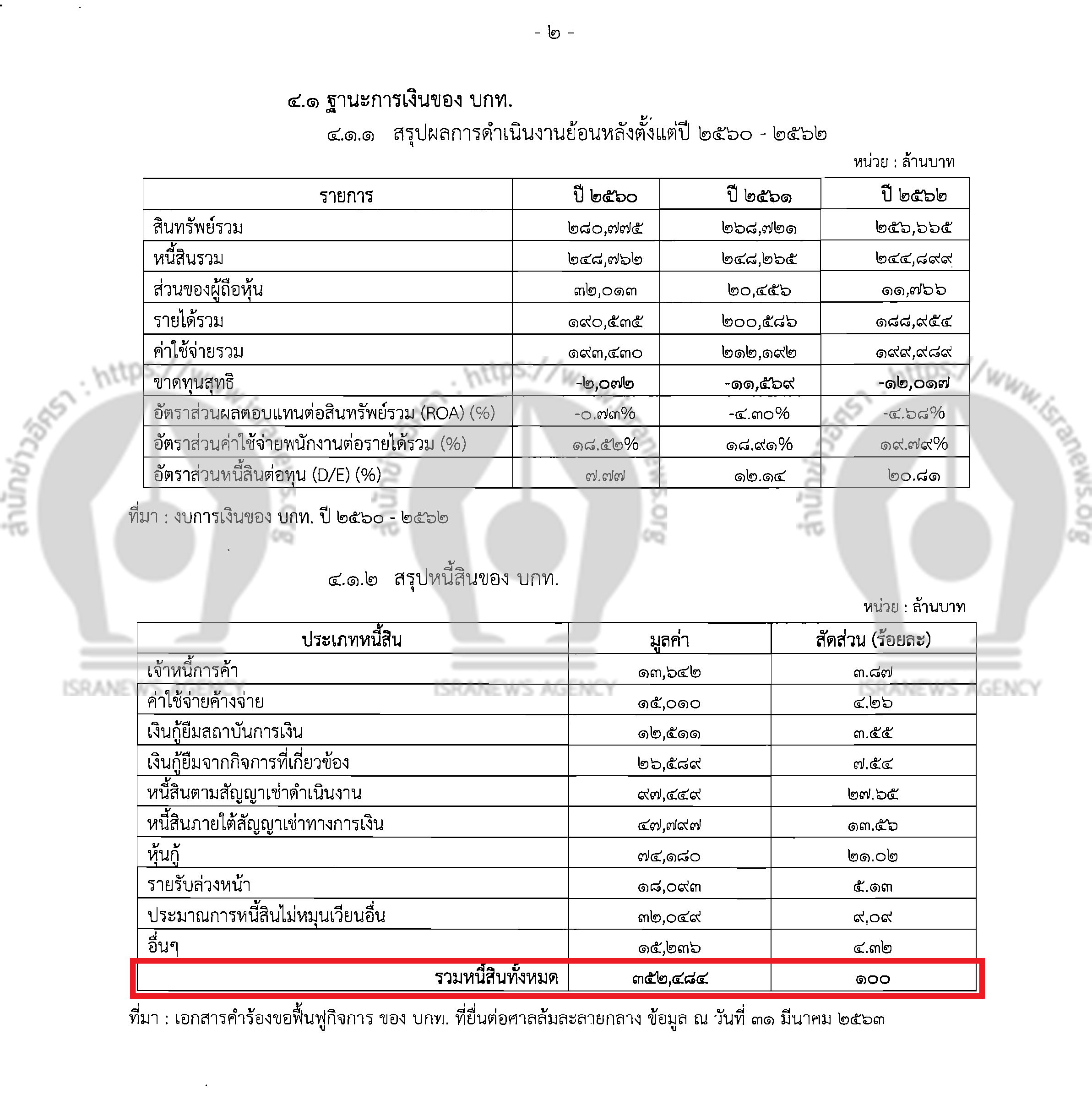 ณ วันที่ 31 มี.ค.63 บริษัท การบินไทย มีหนี้สินทั้งหมด 352,484 ล้านบาท เทียบกับ ณ สิ้นปี 62 ที่บริษัทฯ มีหนี้สิน 244,899 ล้านบาท และมีสินทรัพย์รวม 256,665 ล้านบาท