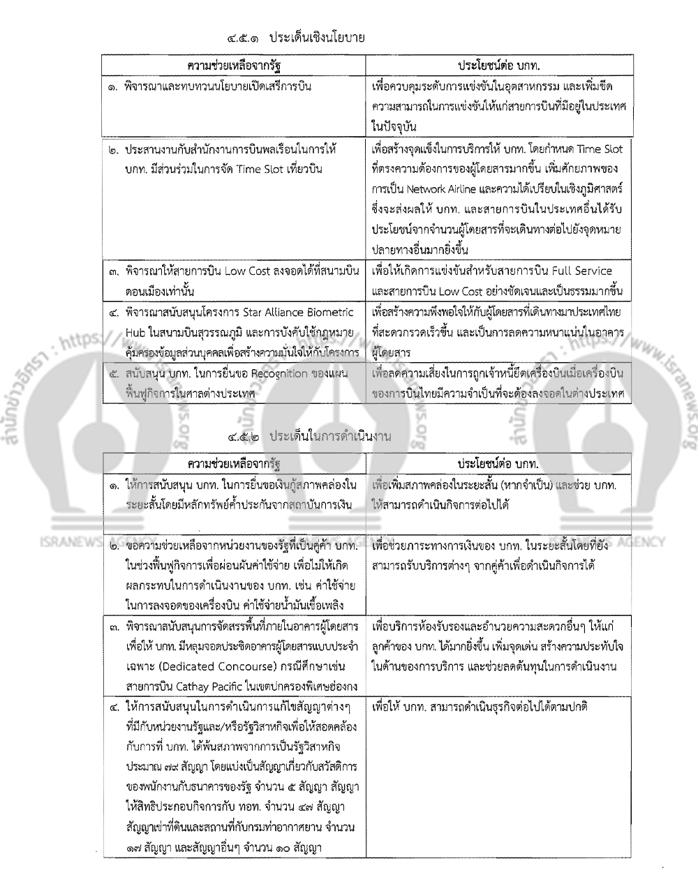 "...1.พิจารณาและทบทวนโยบาย 'เปิดเสรีการบิน' เพื่อทำให้บริษัท การบินไทย มีความสามารถในการแข่งขันให้แก่สายการบินที่มีอยู่ในประเทศในปัจจุบัน 2.ประสานงานกับสำนักงานการบินพลเรือนในการให้บริษัท การบินไทย มีส่วนร่วมในการกำหนด Time Slot เที่ยวบิน เพื่อสร้างจุดแข็งในการบริการให้บริษัท การบินไทย โดยกำหนด Time Slot ที่ตรงความต้องการของผู้โดยสารมากขึ้น เพิ่มศักยภาพของการเป็น Network Airline และความได้เปรียบในเชิงภูมิศาสตร์..."