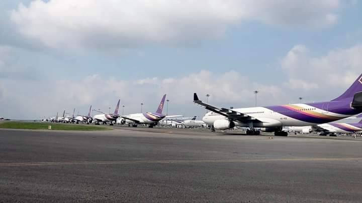 (เครื่องบินของบริษัท การบินไทย จอดบริเวณสนามบินสุวรรณภูมิ ในช่วงหยุดบินในช่วงเดือนเม.ย.63 ขอบคุณภาพ : เพจ AOT official)