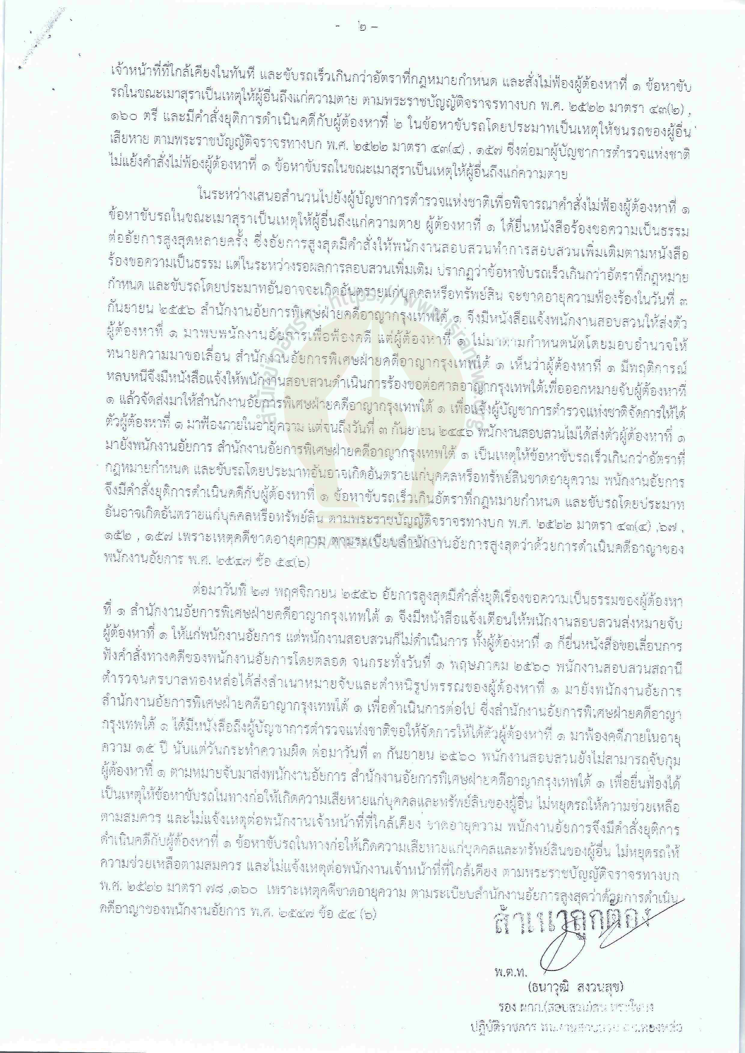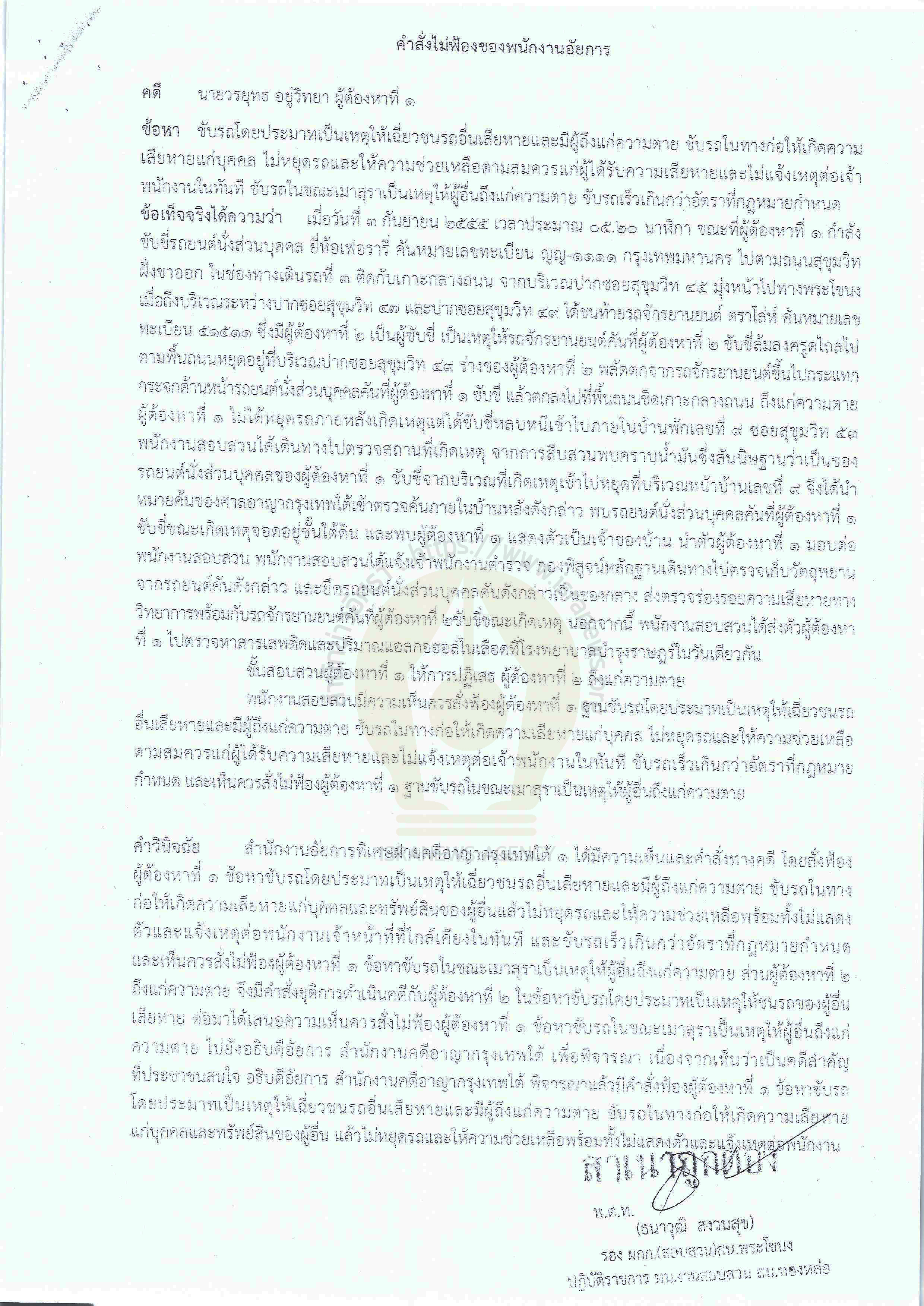 อธิบดีอัยการ สำนักงานคดีอาญากรุงเทพใต้ พิจารณาแล้ว มีคำสั่งฟ้องผู้ต้องหาที่ 1 ข้อหาขับรถโดยประมาท เป็นเหตุให้เฉี่ยวชนรถอื่นเสียหายและมีผู้ถึงแก่ความตาย ขับรถในทางก่อให้เกิดความเสียหาย แก่บุคคลและทรัพย์สินของผู้อื่น ไม่หยุดรถและให้ความช่วยเหลือพร้อมทั้งไม่แสดงตัวและแจ้งเหตุต่อพนักงานเจ้าหน้าที่ที่ใกล้เคียงในทันที และขับรถเร็วเกินอัตราที่กฎหมายกำหนด และสั่งไม่ฟ้องผู้ต้องหาที่ 1 ฐานขับรถในขณะเมาสุรา เป็นเหตุให้ผู้อื่นถึงแก่ความตาย ตามพระราชบัญญัติการจราจรทางบก พ.ศ. 2522 มาตรา 43 (2) , 160 ตรี และมีคำสั่งยุติการดำเนินคดีกับผู้ต้องหาที่ 2 ในข้อหาขับรถโดยประมาท เป็นเหตุให้ชนรถของผู้อื่นเสียหาย ตามพระราชบัญญัติการจราจรทางบก พ.ศ.2522 มาตรา 43 (4), 157 ซึ่งต่อมาผู้บัญชาการตำรวจแห่งชาติ ไม่แย้งคำสั่งไม่ฟ้องผู้ต้องหาที่ 1 ข้อหาขับรถในขณะเมาสุรา เป็นเหตุให้ผู้อื่นถึงแก่ความตาย