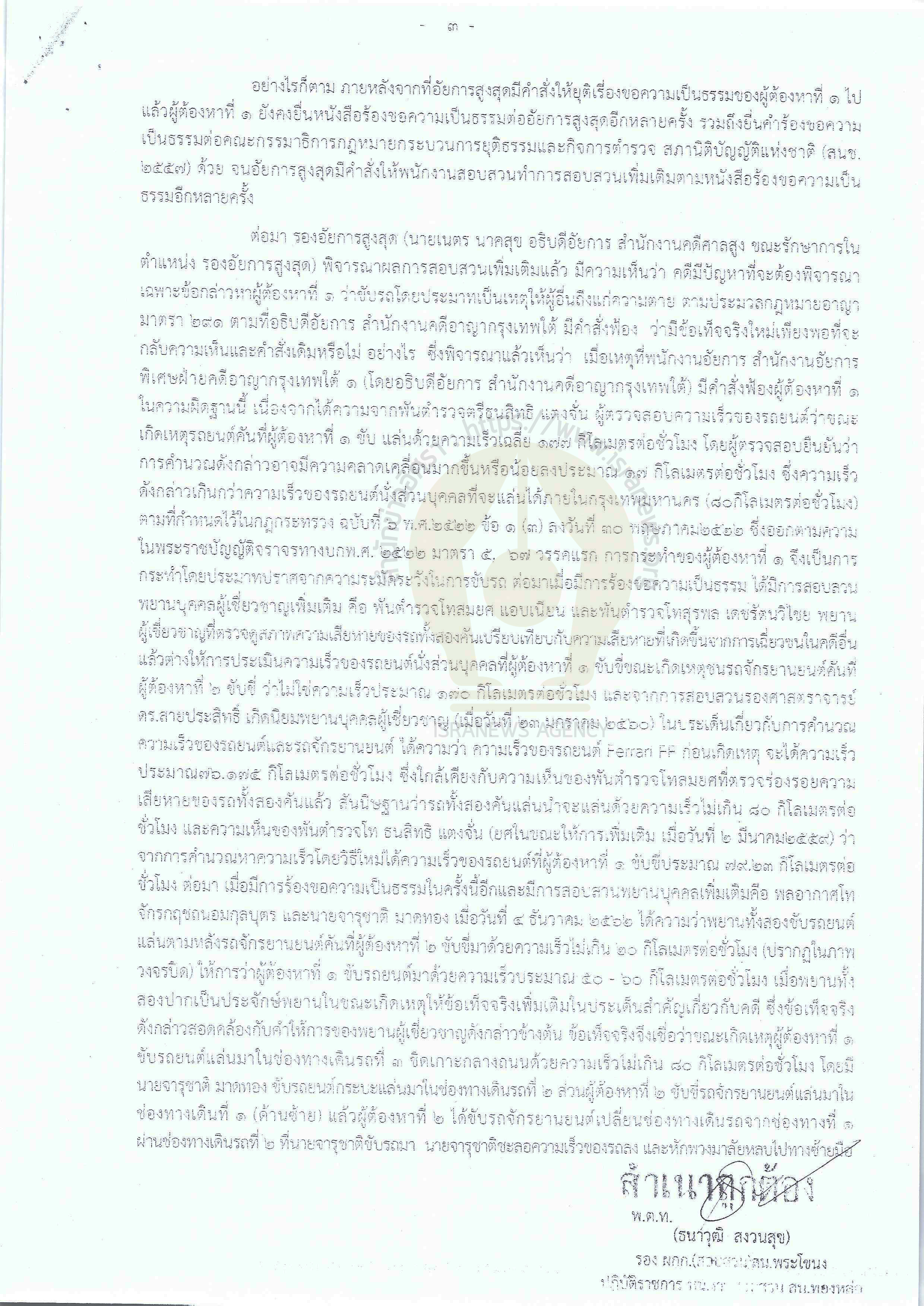 "...ต่อมาเมื่อมีการร้องขอความเป็นธรรมในครั้งนี้อีกและมีการสอบสวนพยานบุคคลเพิ่มเติมคือพลอากาศโท จ. และนาย ช. เมื่อวันที่ 4 ธันวาคม 2562 ได้ความว่าพยานทั้ง 2 ขับรถยนต์แล่นตามหลังรถจักรยานยนต์คันที่ผู้ต้องหาที่ 2 ขับขี่มาด้วยความเร็วไม่เกิน 20 กิโลเมตรต่อชั่วโมง ( ปรากฏในภาพกล้องวงจรปิด ) ให้การว่าผู้ต้องหาที่ 1 ขับรถยนต์มาด้วยความเร็วประมาณ 50-60 กิโลเมตรต่อชั่วโมง ..."