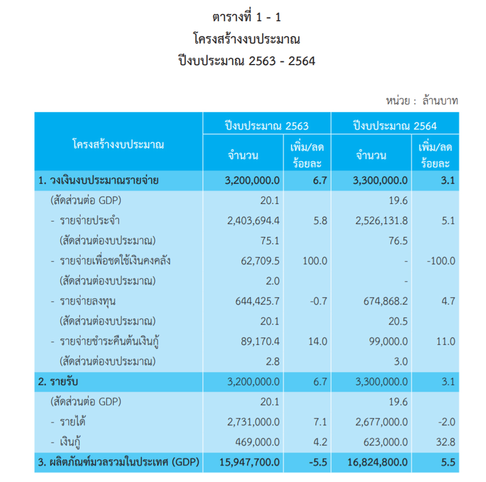 4.1.1 การปรับเพิ่มวงเงินกู้ของรัฐบาลในรณีรายจ่ายสูงกว่ารายได้ในปีงบประมาณ 2563 สถานการณ์การแพร่ระบาดของ COVID-19 ได้ส่งผลกระทบอย่างรุนแรงต่อเศรษฐกิจโลกและเศรษฐกิจไทย โดยสำนักงานสภาพัฒนาการเศรษฐกิจและสังคมแห่งชาติได้คาดการณ์ว่าเศรษฐกิจไทยปี 2563 จะปรับตัวลดลงร้อยละ 5-6