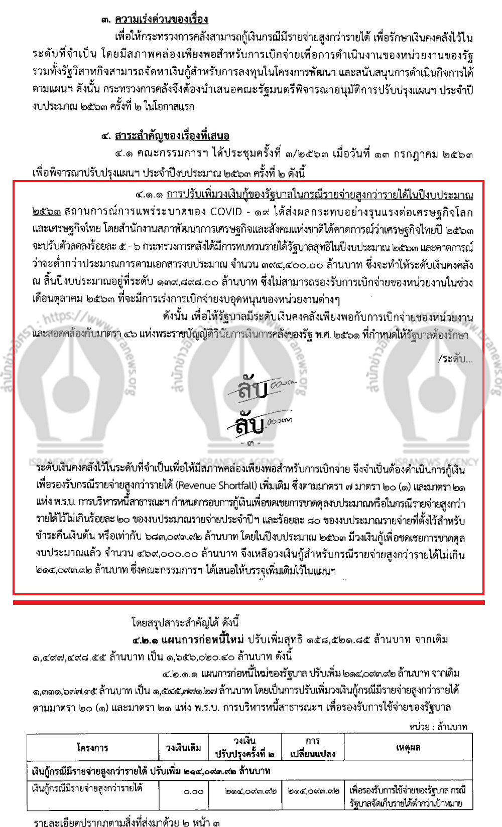 สำนักข่าวอิศรา (www.isranews.org) รายงานว่า จากการตรวจสอบเอกสารมติครม.เมื่อวันที่ 18 ส.ค.63 เรื่อง การปรับปรุงแผนการบริหารหนี้สาธารณะ ประจำปีงบประมาณ 2563 ครั้งที่ 2 ซึ่งเสนอโดย สันติ พร้อมพัฒน์ รมช.คลัง รักษาราชการแทนรมว.คลัง ประธานกรรมการนโยบายและกำกับการบริหารหนี้สาธารณะ