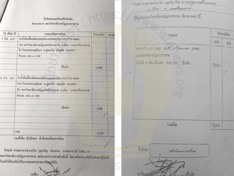 สำหรับจากเอกสารชุดเดียวกันนี้ปรากฏชื่อของ ศ.ดร.ธีระ ถูกนำชื่อไปเบิกจ่ายค่าอ่านงานวิชาการจำนวน 9,000 บาท และค่าน้ำมันรถยนต์ทะเบียน กธ 6733 สงขลา ไป - กลับ จากมหาวิทยาลัยราชภัฏนครศรีธรรมราช จ.นครศรีธรรมราช และ โรงแรมสวนสุนันทา จ.กรุงเทพมหานคร 5,200บาท โดยเอกสารระบุที่อยู่ว่าเป็นมหาวิทยาลัยราชภัฏนครศรีธรรมราช