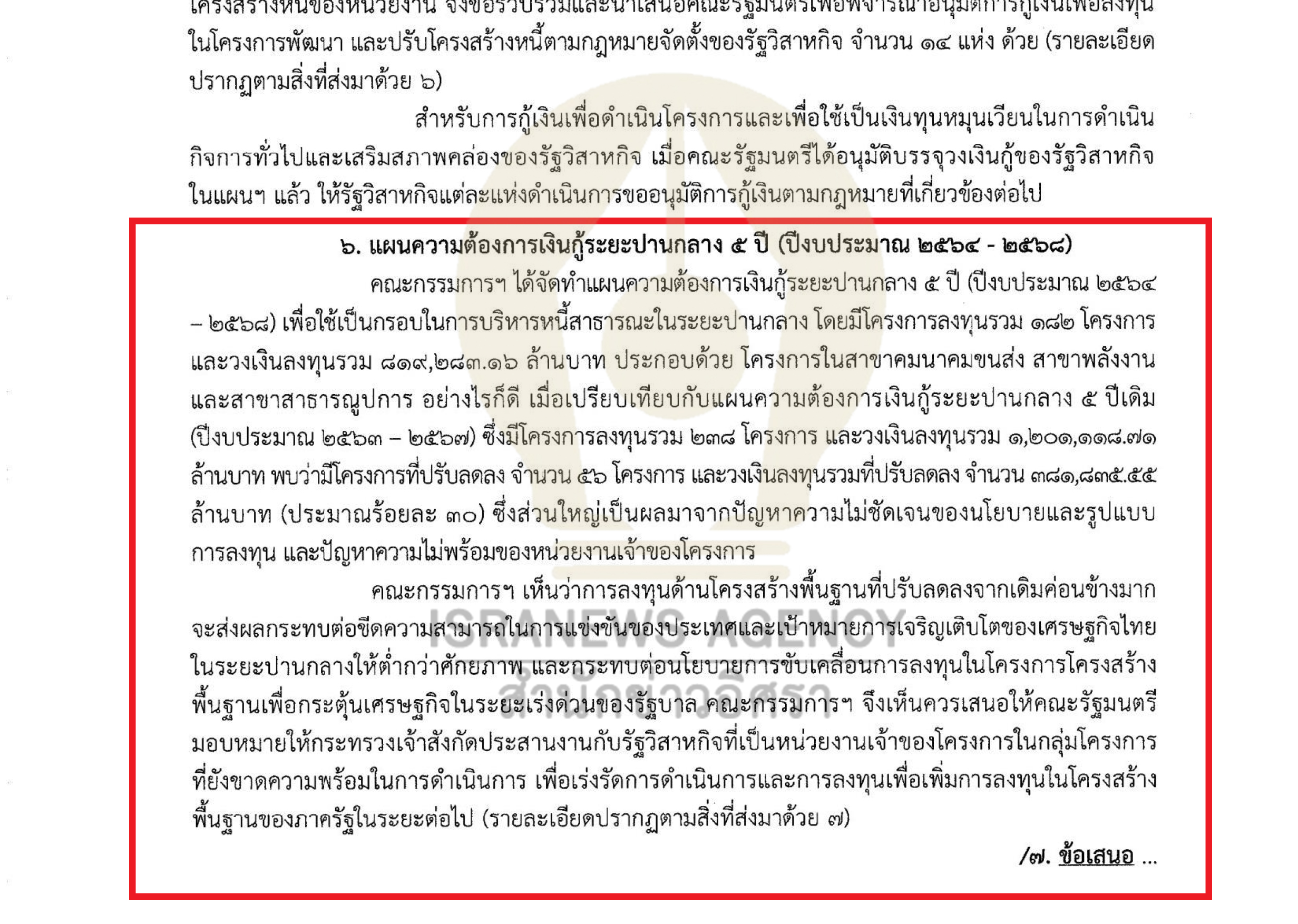 “...การลงทุนด้านโครงสร้างพื้นฐานที่ปรับลดลงค่อนข้างมาก จะส่งผลกระทบต่อขีดความสามารถในการแข่งขันของประเทศ และเป้าหมายการเจริญเติบโตของเศรษฐกิจไทยในระยะกลางให้ต่ำกว่าศักยภาพ และกระทบต่อนโยบายการขับเคลื่อนการลงทุนในโครงการโครงสร้างพื้นฐานเพื่อกระตุ้นเศรษฐกิจในระยะเร่งด่วนของรัฐบาล...”