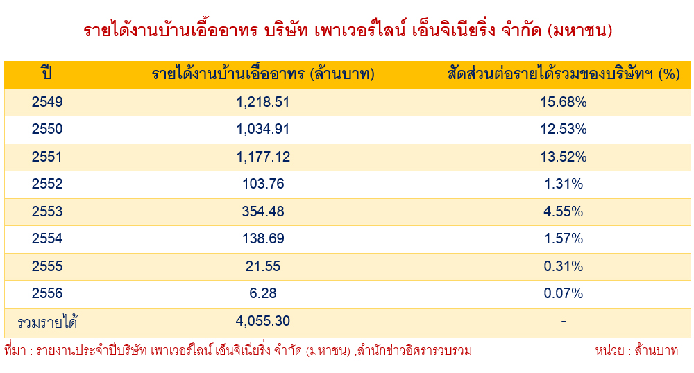 แม้จะถูกปรับลดจำนวนหน่วยก่อสร้างและยกเลิกบางโครงการ แต่จากรายงานงบการเงินของ บมจ.เพาเวอร์ไลน์ เอ็นจิเนียริ่ง พบว่า บริษัทฯมีรายได้จากการก่อสร้างบ้านเอื้ออาทรในช่วงปี 2549-2556 เป็นเงินรวม 4,055.30 ล้านบาท ดังนี้
