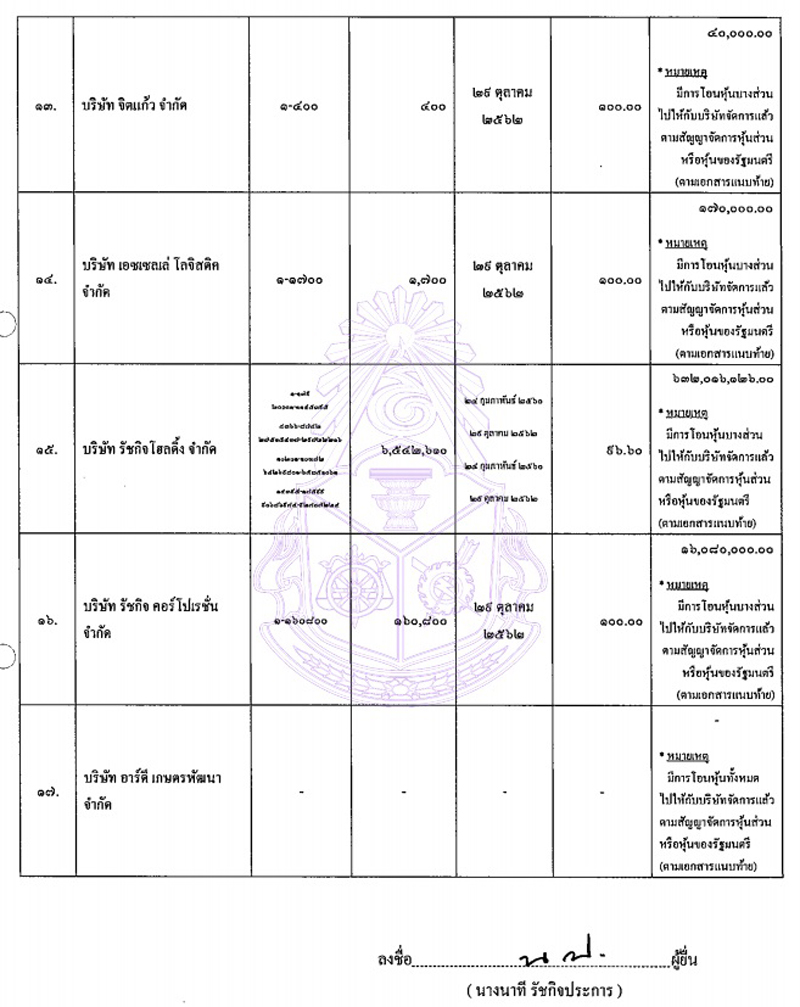 7.บริษัท จิตแก้ว จำกัด 400 หุ้น มูลค่า 40,000 บาท (ระบุหมายเหตุว่า มีการโอนหุ้นบางส่วนไปให้กับบริษัทจัดการตามสัญญาจัดการหุ้นส่วนฯแล้ว) 8.บริษัท เอซเซลเล่ โลจิสติก จำกัด 1,700 หุ้น มูลค่า 1.7 แสนบาท (ระบุหมายเหตุว่า มีการโอนหุ้นบางส่วนไปให้กับบริษัทจัดการตามสัญญาจัดการหุ้นส่วนฯแล้ว) 9.บริษัท รัชกิจ โฮลดิ้ง จำกัด 6,542,610 หุ้น มูลค่า 632,016,126 บาท (ระบุหมายเหตุว่า มีการโอนหุ้นบางส่วนไปให้กับบริษัทจัดการตามสัญญาจัดการหุ้นส่วนฯแล้ว)