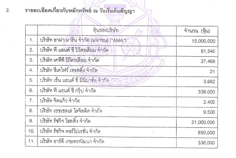 1.บริษัท อาม่า มารีน จำกัด (มหาชน) (AMA) จำนวน 15,000,000 หุ้น 2.บริษัท พี แอนด์ ซี ปิโตรเลียม จำกัด จำนวน 91,540 หุ้น 3.บริษัท เคทีพี ปิโตรเลียม จำกัด 27,468 หุ้น 4.บริษัท ซีเคไฟว์ เทรดดิ้ง จำกัด 21 หุ้น 5.บริษัท เอ็น แอนด์ ซี มินิมาร์ท 3,662 หุ้น 6.บริษัท พี แอนด์ ซี กรุ๊ป จำกัด 336,000 หุ้น 7.บริษัท จิตแก้ว จำกัด 2,400 หุ้น 8.บริษัท เอชเชลเล่ โลจิสติค จำกัด 9,500 หุ้น 9.บริษัท รัชกิจ โฮลดิ้ง จำกัด 31,000,000 หุ้น 10.บริษัท รัชกิจ คอร์โปเรชั่น จำกัด 850,000 หุ้น 11.บริษัท อาร์ดี เกษตรพัฒนา จำกัด 336,000 หุ้น