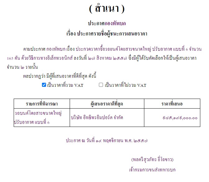 27 ส.ค.2557 ขส.ทบ. โดย พล.ต.พรชัย ดวงเนตร เจ้ากรมการขนส่งทหารบก ออกประกาศกองทัพบก เรื่อง ประกวดราคาซื้อรถยนต์โดยสารขนาดใหญ่ ปรับอากาศ แบบที่ 6 จำนวน 165 คัน ด้วยวิธีการทางอิเล็กทรอนิกส์ กำหนดยื่นซองเอกสารประกวดราคา ในวันที่ 5 ก.ย.2557 และกำหนดเสนอราคาในวันที่ 11 ก.ย. 2557