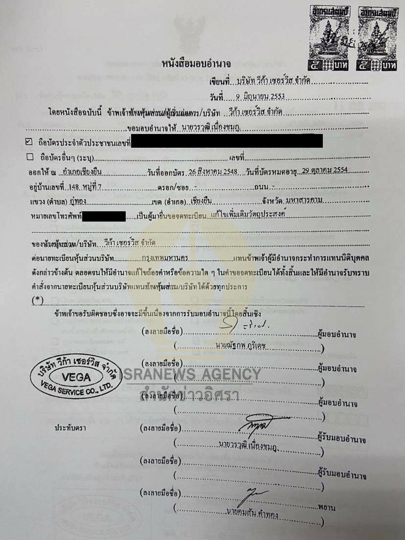 ในการจดทะเบียนแก้ไขเพิ่มเติมวัตถุประสงค์ บริษัท วีก้า เซอร์วิส จำกัด เมื่อวันที่ 11 มิ.ย.2553 บริษัทฯมอบอำนาจให้ นายวรวุฒิ เนื่องชมภู เป็นผู้ยื่นจดทะเบียนต่อนายทะเบียนตามหนังสือมอบอำนาจวันที่ 9 มิ.ย.2553 (ดูเอกสาร)